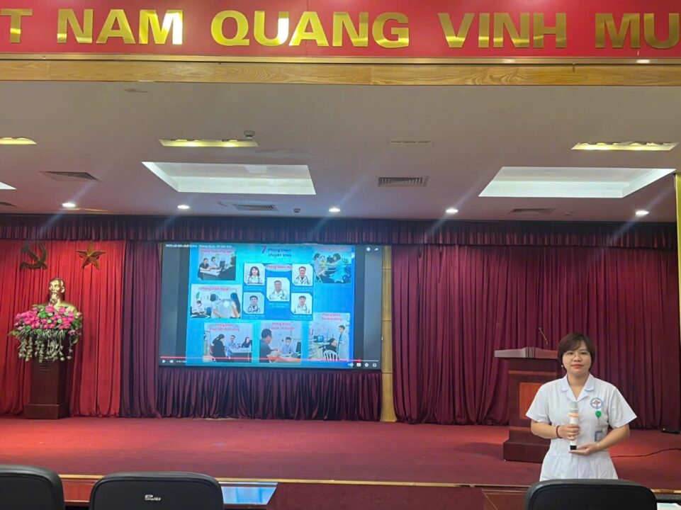 👩 Đồng hành cùng buổi tập huấn, ThS. Trịnh Thị Lan Anh – Trưởng phòng Quản lý chất lượng giới thiệu video minh họa mô hình AIDET được triển khai tại nhiều bệnh viện và tại Bệnh viện đa khoa Sóc Sơn.